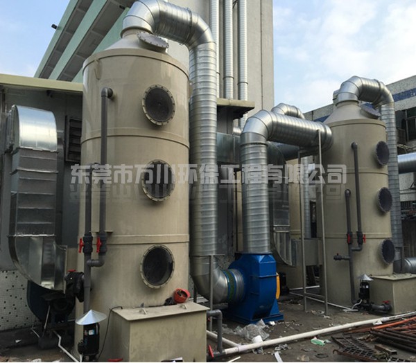 噴淋塔也叫水淋塔,是以水為介質處理粉塵。含塵氣體從塔體下方進氣口沿切向進入噴淋塔,在風機的作用下,迅速充滿進氣段空間,然后塔頂位置的噴淋頭向下噴水,水與含塵廢氣接觸,使得空氣和粉塵分離,達到除塵的效果。噴淋塔具有結構簡單、造價低、占地面積小、凈化效率高等優點,能夠處理高溫、高濕的氣流,將著火、爆炸的可能減至最低。經治理后,污染物排放達到標準:執行《廣東省大氣污染物排放標準》(DB44/27-2001)中第二時段一級標準。