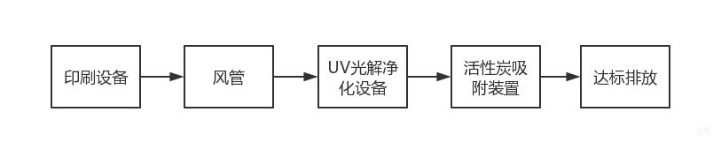 生產過程中產生的印刷廢氣通過風機的作用下進入風管,首先廢氣會進入UV光解凈化設備,然后印刷廢氣會進入活性炭吸附裝置,最后達標排放。